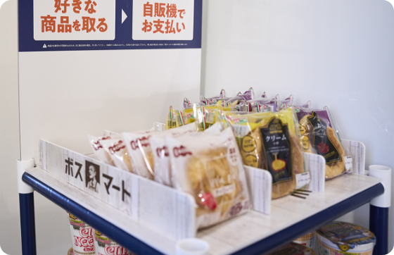 社内にお菓子、軽食販売ワゴン設置(自販機で清算)。