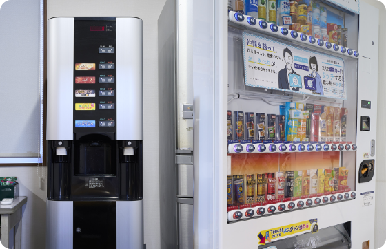 休憩室に給茶機あり。工場内自販機(社長のおごり自販機1週間に1本おごり)